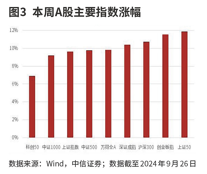 当天下午开盘,大盘全线拉升。上证指数从2700多点突破3000点,仅用三个交易日,A股成交金额上升至约1.17万亿元,创下阶段性新高。截至当天,A股主要大盘指数,本周涨幅均超6%,其中上证50指数本周涨幅更是达11.86%。